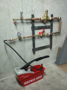 En este primer corte se lograron cambiar 10 válvulas, por lo cual deberemos repetir el corte al menos en dos nuevas oportunidades. Estos trabajos estan siendo realizados por Wilson en sus funciones de Auxiliar de Mantención, quien fue entrenado exitosamente en un banco de prueba que fue construido simulando los componentes de la línea de agua del edificio, asi pudo practicar las uniones y soldaduras, las cuales adicionalmente fueron sometidas a presión por medio de una bomba manual, alcanzando hasta 25 bar, lo cual es hasta 8 veces la presión de la linea de agua caliente del edificio.